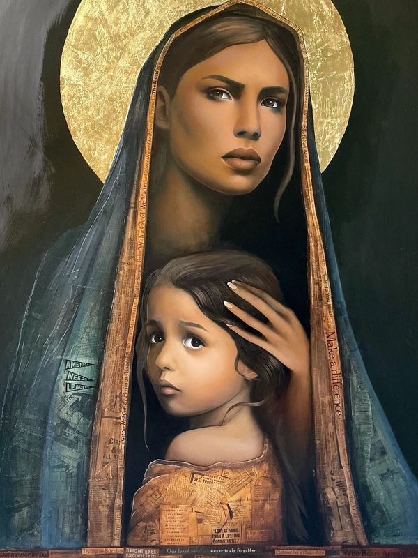 With all the turbulence we were going through I needed to paint something comforting, soothing to my nerves. To me this woman is a guardian angel, a lost loved one looking out for this child in a hostile world. And the little girl is all of us.