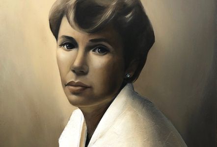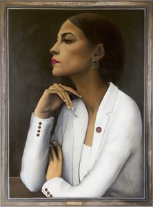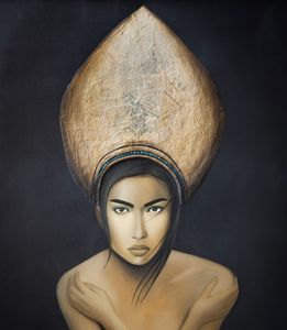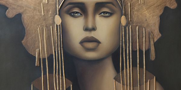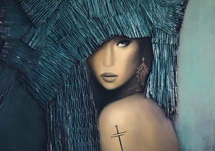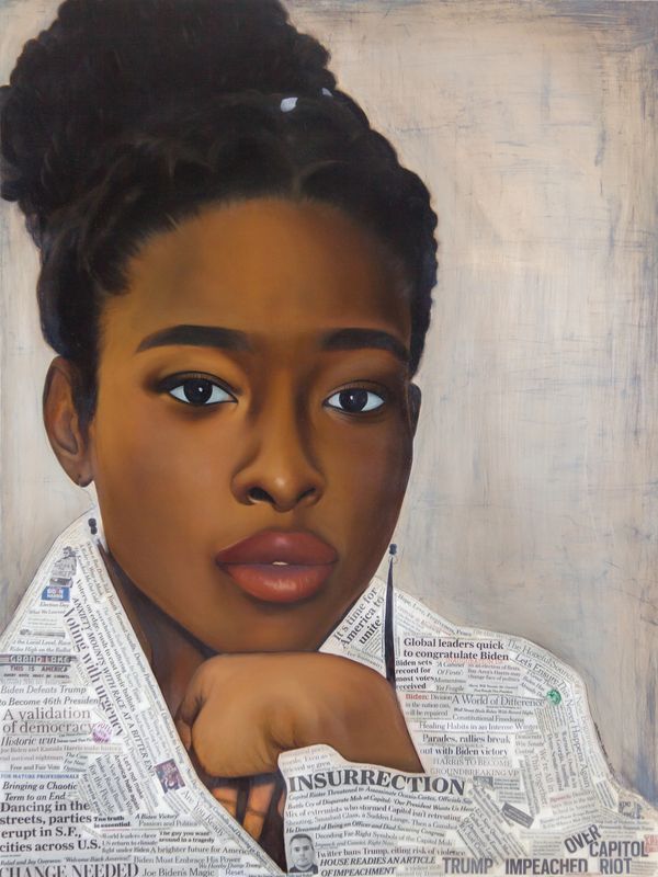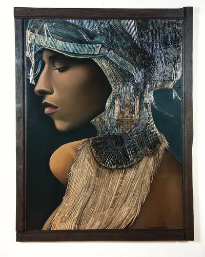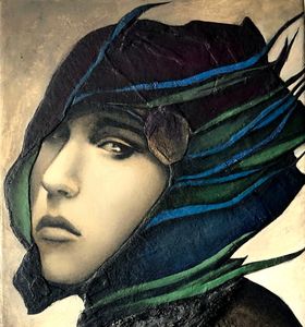 I used mixed media for her headdress, using cardboard packaging material and oil paint to build the relief and the collage is made from article headlines as the war first unfolded. The rest was painted in oil.